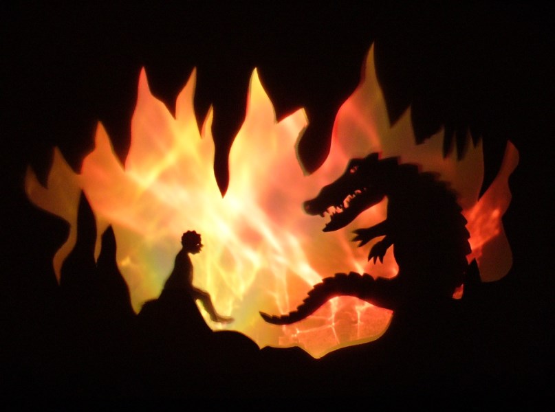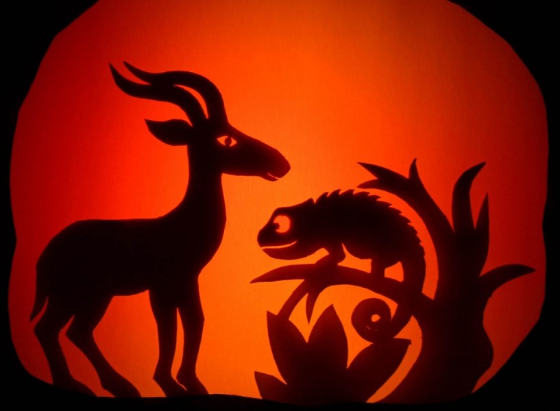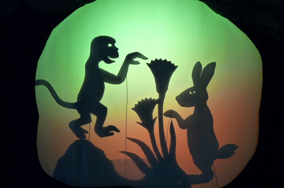 In der Schattentheaterbühne wird die Geschichte mit Schattenfiguren, farbigem Licht, Effekten und Musik erzählt.