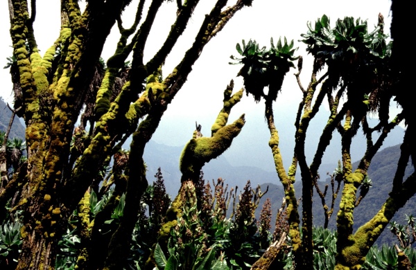 Nebelwälder und Schneegipfel des Ruwenzori-Gebirges.